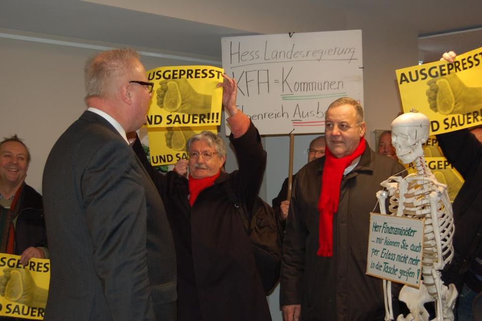 Anlässlich einer Bürgermeister Dienstversammlung, unter Mitwirkung des Hess.Finanzminister Schäfer, demonstrierten am vergangenen Mittwoch im Bürgerhaus von Oberkaufungen parteiübergreifend, Gemeindevertreter/innen aus dem Landkreis Kassel gegen den Kommunalen Finanzausgleich der Hessischen Landesregierung. Die Demonstration stand unter dem Motto: AUSGEPRESST UND SAUER !